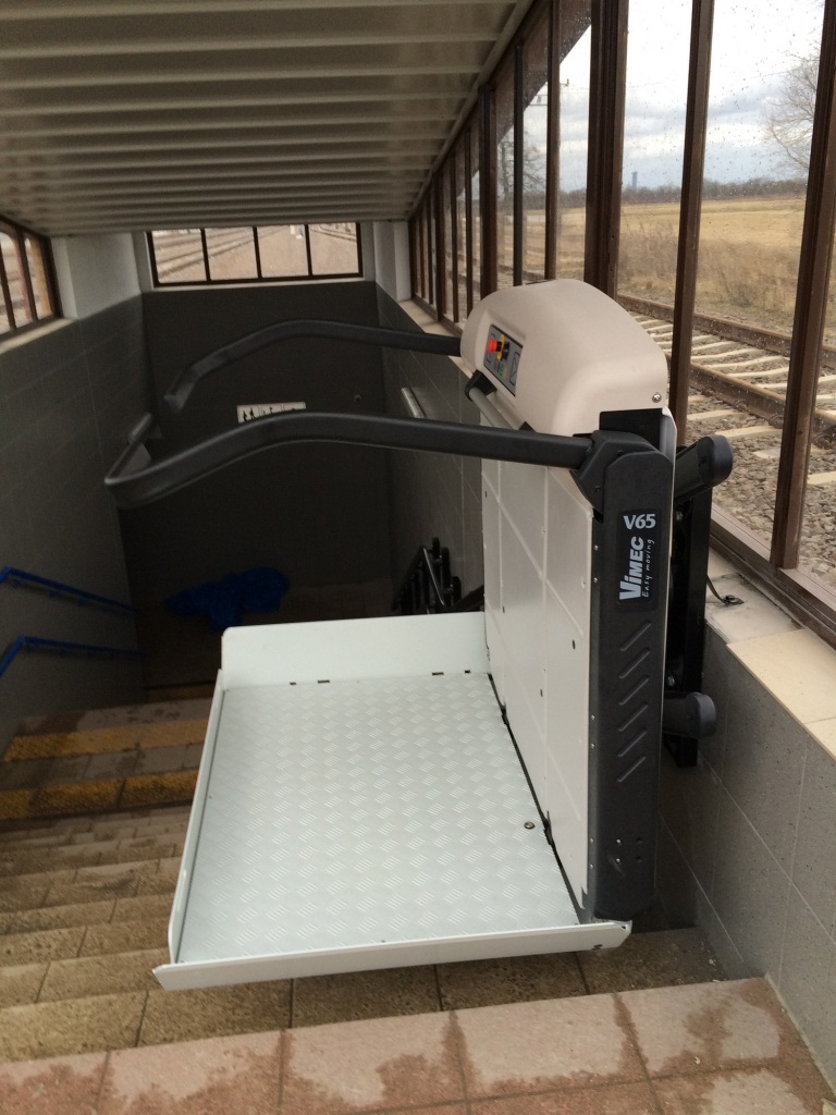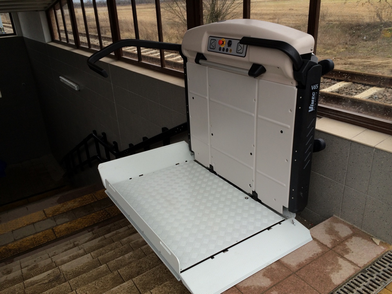 Platforma schodowa V65 to bardzo uniwersalne urządzenie służace do przewozu osób niepełnosprawnych poruszających się na wózkach. Znakomicie spełni swoją funkcję udostępniając niepełnosprawnym podróżnym perony Dworca Osobowice we Wrocławiu.