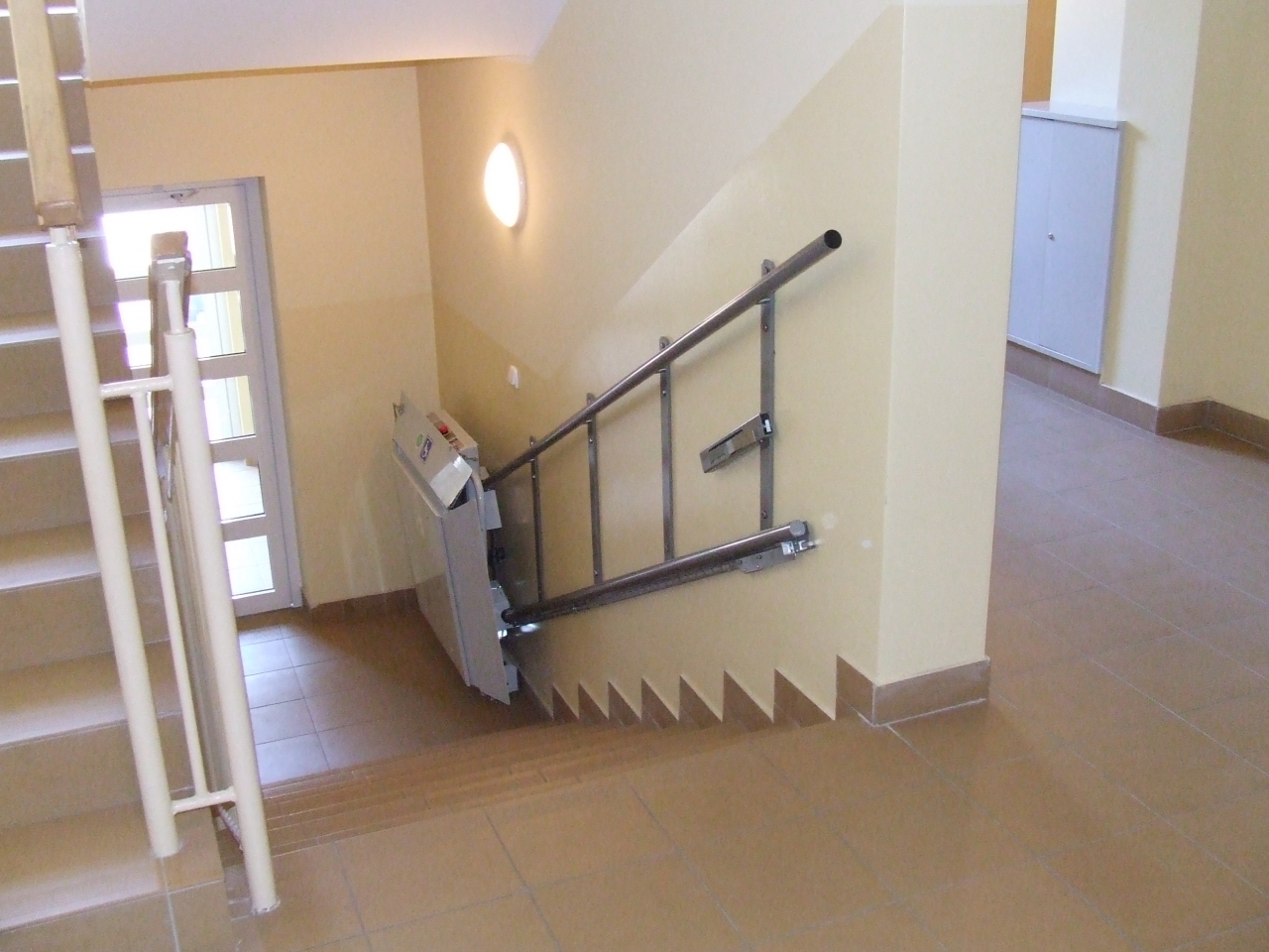 Proponowane Państwu urządzenie jest idealnym rozwiązaniem przy nie ograniczonej liczbie kondygnacji schodów, po warunkiem, że są one w linii prostej bez zakrętów. Uruchomienie platformy odbywa się przy użyciu pilota znajdującego się na panelu sterowniczym. Podczas postoju na przystanku odbywa się ładowanie akumulatorów ukrytych w części napędowej platformy. Dzięki takiemu rozwiązaniu, z urządzenia można korzystać, nawet jeżeli zabraknie prądu w sieci.